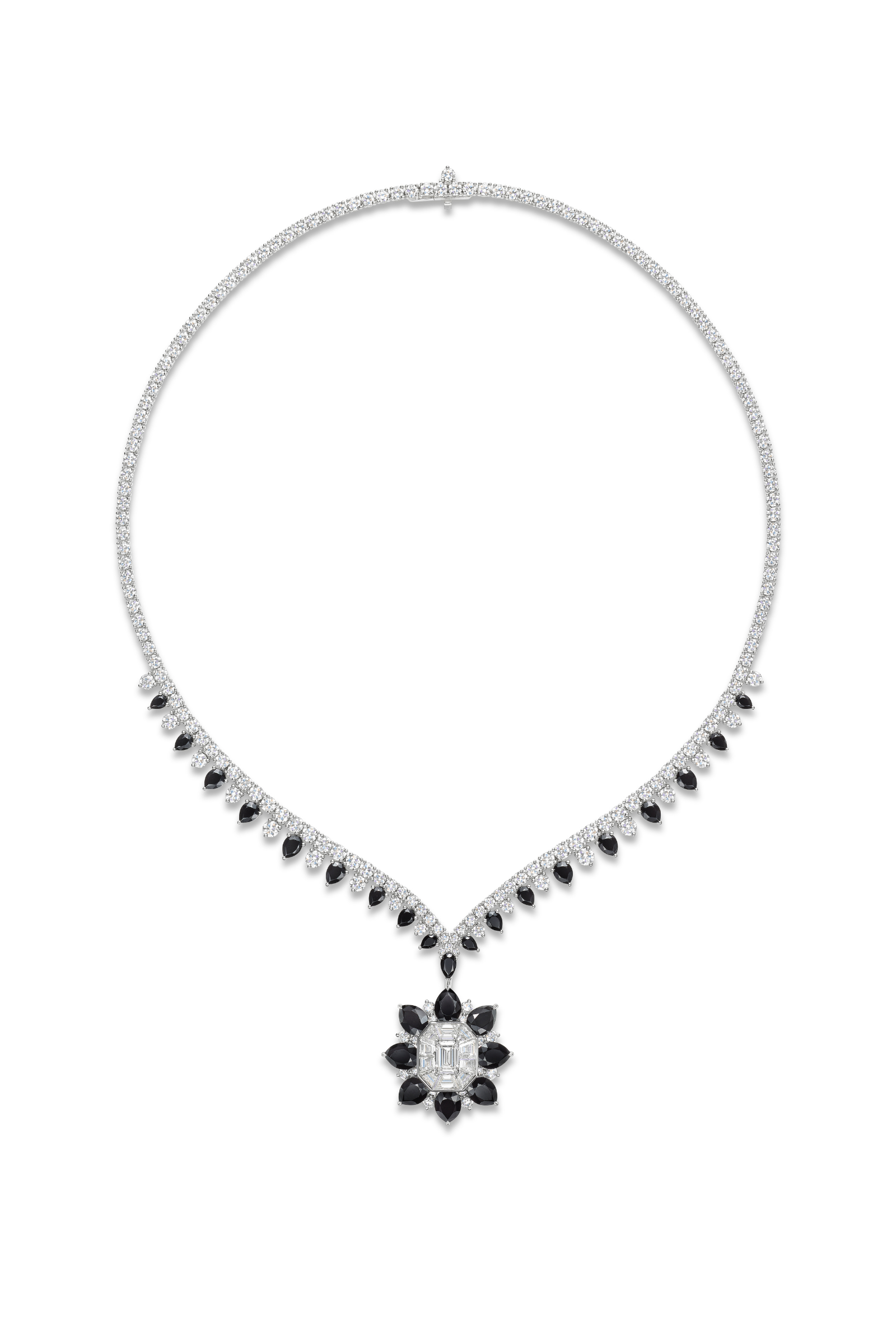 Inspiriert von den schwarz-weißen Facetten des Marmors im Salon verwandeln die Juwelen Präzision und Farbkontraste in geometrische Fülle. Bestehend aus einem Ensemble aus Collier, Ohrringen und Ring, zeichnet sich das Design durch ein Arrangement aus zehn Edelsteinen im Tropfenschliff gefasst um mehrere Diamanten im Smaragdschliff aus, das Farbe und Licht zu einem prächtigen Kunstwerk verschmelzen lässt.
